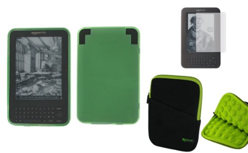 3n1 rooCASE Super Bubble Neoprene (Neon Green / Black) Sleeve Case / TPU Flex Matte (Green) Silicone Skin Case Cover / Screen Protector for Amazon Kindle Wireless Reading Device with 6" Display 3G Wi-Fi (3rd Generation and Latest Generation)