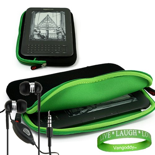 Amazon Kindle 3 ( Wifi Only , Wifi + 3G ) ( Latest Generation ) Accessories Kit: Black with Emerald Green Carrying Sleeve With Extra Pocket + Kindle Earphones with Microphone + A Live*Laugh*Love Wrist Band!!!