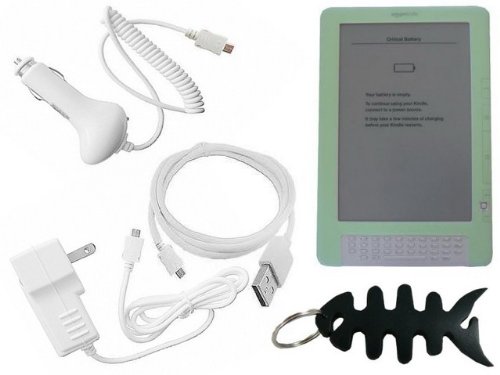Amazon Kindle DX (Green) Protective Electronic Book Reader Silicone Skin Gel Case Cover, USB 2in1 Sync and Charging Cable, Car Charger, Wall / Travel Charger and and Fishbone Style Keychain