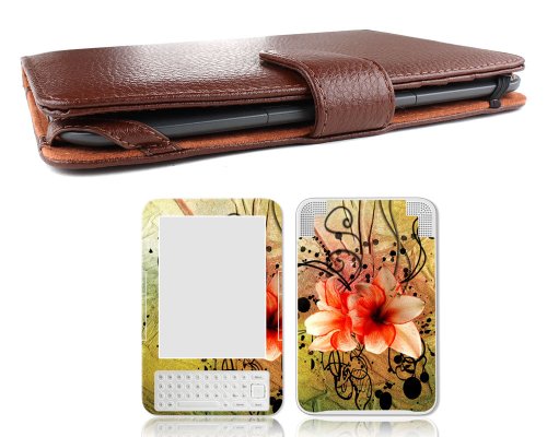 This monster bundle deal includes a genuine leather cover case, design skin, and screen protector for the Amazon Kindle 3rd Generation 6" Display ereader only. The exterior surface presents a sturdy and stylish leather texture, and your Kindle 3 is secured by four corner straps, and also held close with outside magnetic clasp. The designed skin is made up of superb vinyl material that is environmental friendly with an upscale leather-like finish to distinguish your ereader (See close up shot image). ** TIP ON APPLICATION: Very important to first align accurately and then slowly apply from lower edge to the top edge. Material is made to be slightly stretchable to aid a good fit. Screen protector helps protect your screen from scratches Easy application. NOTE: Due to differences between monitor displays, actual color may vary slightly from image. Case weight: 5.5oz. Dimensions: 7.7in x 5.2in x 0.7in