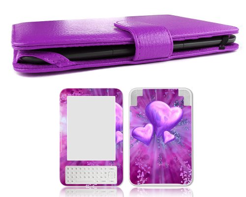 This monster bundle deal includes: (1) Genuine Leather Case, Color: PURPLE, (1) Vinyl Skin (As viewed in the main photo), (1) Screen Protector for the Amazon Kindle 3 ereader also known as the "Kindle Keyboard". ABOUT THE COVER: Designed to fit the Amazon Kindle 3 (aka Kindle Keyboard) ereader device only. The case is made from high quality genuine leather and gives excellent protection to your Kindle 3. The device is securely held in place by four leather straps and is also held close with an outside magnetic clasp. The inside of the case has useful compartments to hold cards, driver license, money, and etc. Color: Purple, Weight: About 5.5 oz., Dimensions: 19.5cm x 13.2cm x 1.7cm (7.7" x 5.2" x .7"). ABOUT THE SKIN: Style up your Kindle 3 with a beautiful design. Skins are made up of a superb vinyl material that is environmental friendly. With the skin decal on your device - it fits well into most accessories and cases and leaves no sticky residue upon removal. The installation is simple and does not come with instructions - the skin design is pre-perforated and requires no trimming. TIP for putting on skin design: First align accurately and then slowly apply from one edge to the opposite side, eliminating minimal amount of bubbles when necessary. NOTE: Due to differences between monitor displays, actual color may vary slightly from image. This combo WILL NOT FIT: Kindle 2, Kindle DX, Kindle 4 (Released September 28, 2011), Kindle Touch or Kindle Fire. ***INFORMATION ON THE KINDLE 3 (Kindle Keyboard): Release Date: August 2010, Dimensions - 7.5" x 4.8" (length/width), 6" Black and White Screen, Built-In Keyboard, Audio - Rear speakers, top corners.