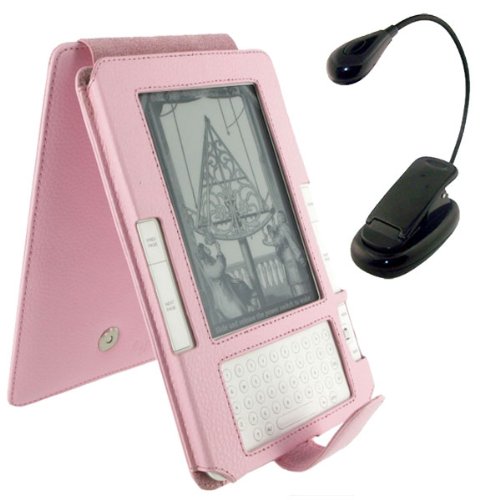 Pink Full Genuine Leather Flip Case and Book Light for Amazon Kinde 2 (Old Version) E-Reader Reading Device (Kindle NOT Included)